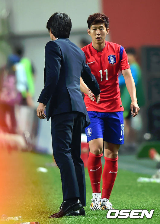 28일 오후 서울월드컵경기장에서 '2014 브라질 월드컵' 한국- 튀니지의 평가전, 후반 홍명보 감독이 교체되어 나온 손흥민을 격려하고 있다.