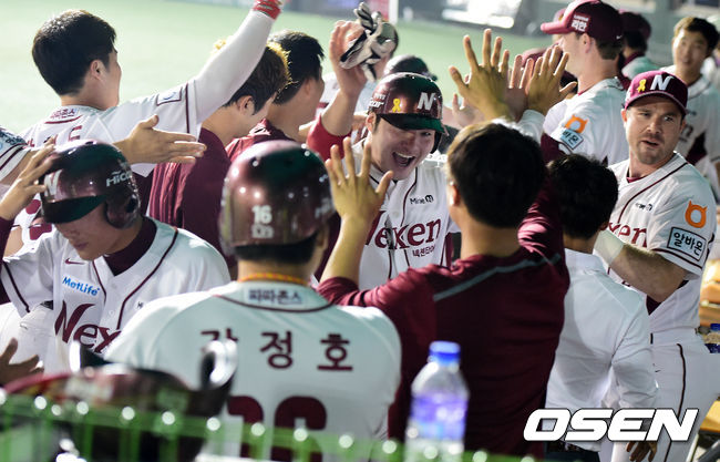 8회말 2사 만루에서 넥센 강정호가 역전 만루 홈런을 날리고 더그아웃에서 동료선수들과 기뻐하고 있다.