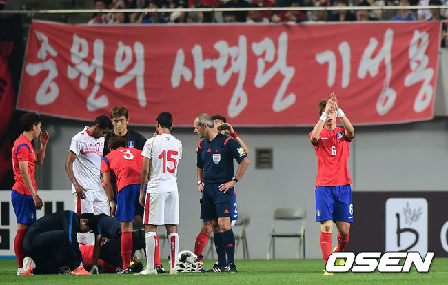 28일 오후 서울월드컵경기장에서 '2014 브라질 월드컵' 한국- 튀니지의 평가전, 후반 기성용이 부상 당한 홍정호를 교체해 달라는 사인을 보내고 있다.