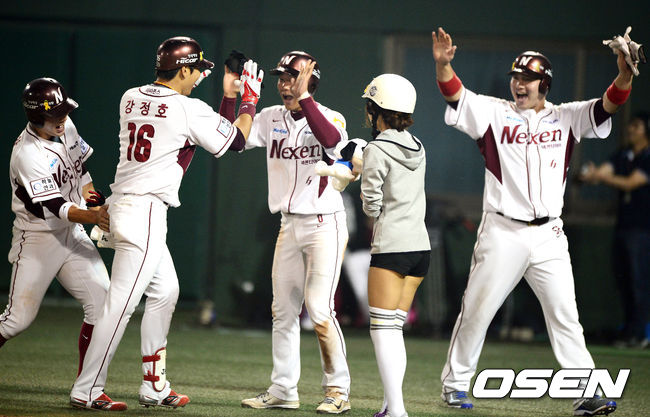 8회말 2사 만루에서 넥센 강정호가 역전 만루 홈런을 날리고 홈을 밟으며 동료선수들과 기뻐하고 있다.