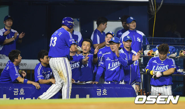 9회초 삼성 공격 2사 2루 상황 채태인의 1타점 적시 중전 안타 때 홈을 밟은 박한이가 더그아웃 동료들과 인사를 나누고 있다.
