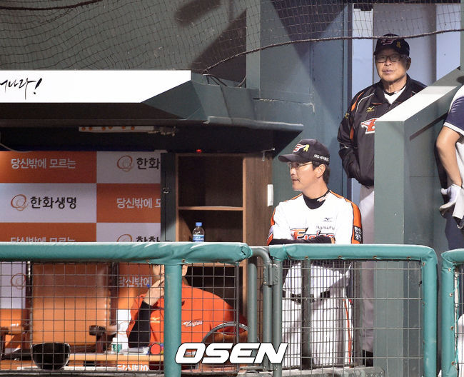 9회말 한화 김응룡 감독이 더그아웃 감독석 자리를 떠나 경기를 관전하고 있다./ ajyoung@osen.co.kr