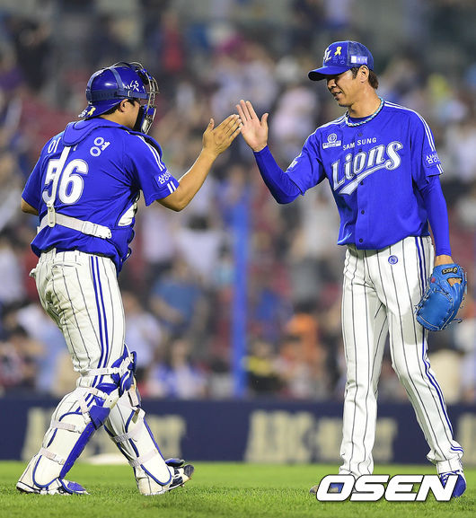 경기 종료 직후 삼성 투수 임창용과 포수 이지영이 인사를 나누고 있다./dreamer@osen.co.kr