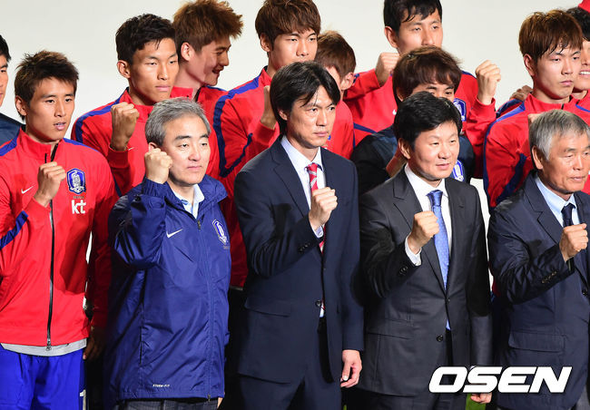 경기 종료 후 출정식에서 한국 홍명보 감독이 선수 및 관계자들과 기념촬영을 하고 있다./sunday@osen.co.kr