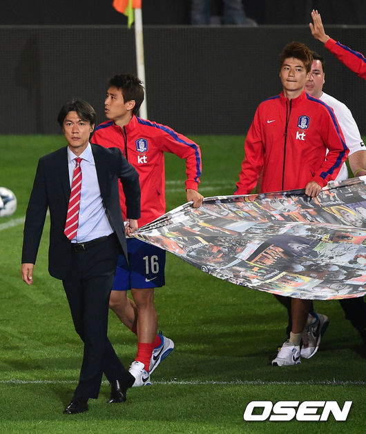 경기 종료 후 한국 홍명보 감독이 대형태극기를 들고 동료들과 관중석을 향해 인사를 하고 있다./sunday@osen.co.kr
