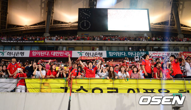 경기 종료 후 한국축구국가대표팀이 대형태극기를 들고 관중석을 향해 인사를 할때 붉은 악마들이 환호하고 있다./rumi@osen.co.kr