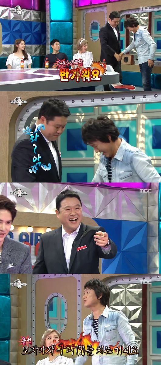 오렌지 주스를 내뱉는 리액션으로 화제가 된 박동빈이 등장하자 김구라가 직접 다가가 악수를 하며 인사했다.
