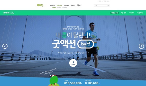 션이 지난 28일 '해피빈'과 함께 오픈한 ‘내 콩이 달린다! 굿액션 by 션’ 캠페인은 네티즌이 기부한 ‘해피빈 콩’ 개수를 거리로 환산해 션이 직접 달리는 미션완수 캠페인. 캠페인에 참여해 콩을 기부하면, 자신이 기부한 콩을 션이 달렸는지 확인 할 수 있다.