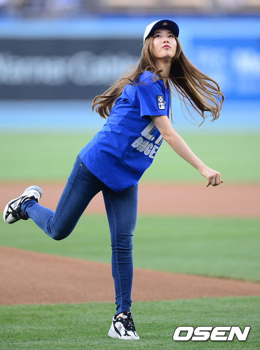 [OSEN=다저스타디움(LA 미국 캘리포니아주), 백승철]미쓰에이 수지가 29일(이하 한국시간) 다저스타디움을 찾아 LA 다저스와 신시내티 레즈전에 앞서 수지가 멋진 폼으로 시구를 하고 있다.