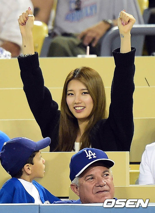 29일(이하 한국시간) 미국 캘리포니아주 로스앤젤레스 다저스타디움에서 열린 '2014 메이저리그' LA 다저스와 신시내티 레즈의 경기, 수지가 관중석에서 응원을 하고 있다.