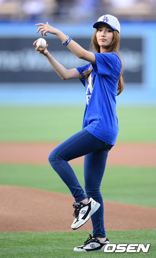 [OSEN=다저스타디움(LA 미국 캘리포니아주), 백승철]미쓰에이 수지가 29일(이하 한국시간) 다저스타디움을 찾아 LA 다저스와 신시내티 레즈전에 앞서 수지가 멋진 폼으로 시구를 하고 있다.