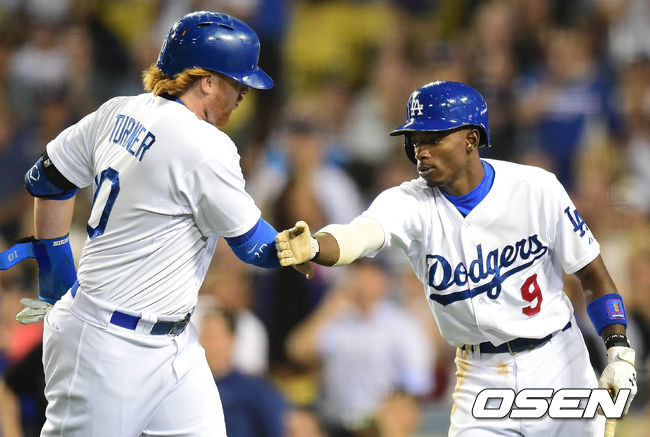 29일(이하 한국시간) 미국 캘리포니아주 로스앤젤레스 다저스타디움에서 열린 '2014 메이저리그' LA 다저스와 신시내티 레즈의 경기 5회말 1사 3루 커쇼 타석, 패스트볼로 득점한 3루주자 터너가 고든과 하이파이브를 하고 있다.