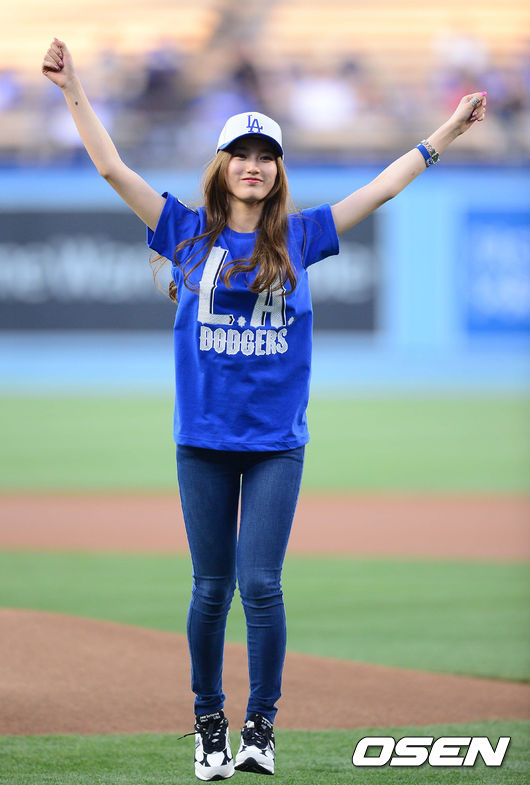 [OSEN=다저스타디움(LA 미국 캘리포니아주), 백승철]미쓰에이 수지가 29일(이하 한국시간) 다저스타디움을 찾아 LA 다저스와 신시내티 레즈전에 앞서 수지가 시구를 하고 있다.