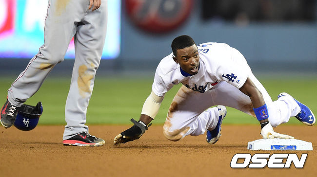 29일(이하 한국시간) 미국 캘리포니아주 로스앤젤레스 다저스타디움에서 열린 '2014 메이저리그' LA 다저스와 신시내티 레즈의 경기 8회말 무사 1루 이디어의 희생번트 상황에 힛앤런을 시도하던 1루주자 고든이 2루에서 세이프되고 있다.