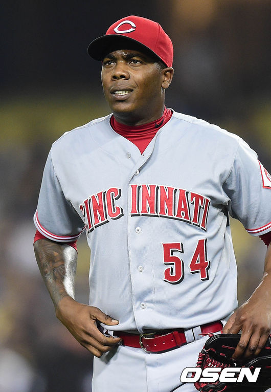 29일(이하 한국시간) 미국 캘리포니아주 로스앤젤레스 다저스타디움에서 열린 '2014 메이저리그' LA 다저스와 신시내티 레즈의 경기 9회말 마운드에 오른 채프먼이 피칭 준비를 하고 있다.