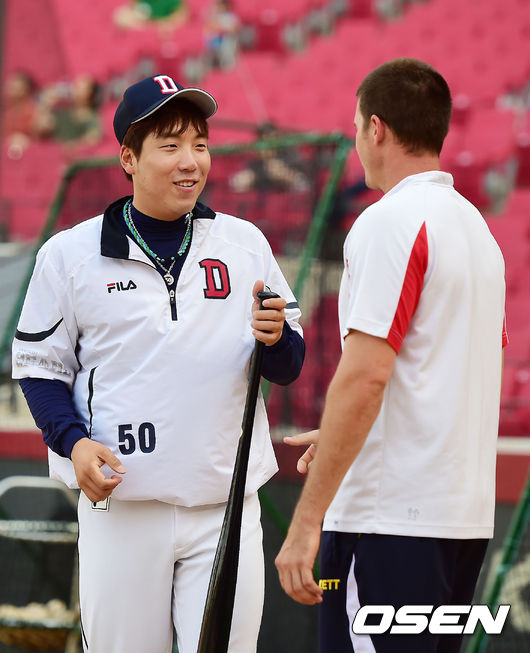 29일 오후 광주-KIA 챔피언스필드에서 2014 한국야쿠르트 세븐 프로야구 KIA와 두산의 경기가 열릴 예정인 가운데 양 팀 훈련시간에 두산 김현수가 KIA 브렛 필에게 자신의 배트를 선물로 주고 있다.