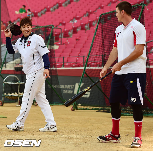 29일 오후 광주-KIA 챔피언스필드에서 2014 한국야쿠르트 세븐 프로야구 KIA와 두산의 경기가 열릴 예정인 가운데 양 팀 훈련시간에 두산 김현수가 KIA 브렛 필에게 자신의 배트를 선물로 준 후 인사를 하고 있다.