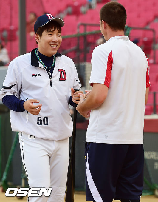 29일 오후 광주-KIA 챔피언스필드에서 2014 한국야쿠르트 세븐 프로야구 KIA와 두산의 경기가 열릴 예정인 가운데 양 팀 훈련시간에 두산 김현수가 KIA 브렛 필에게 자신의 배트를 선물로 주고 있다.