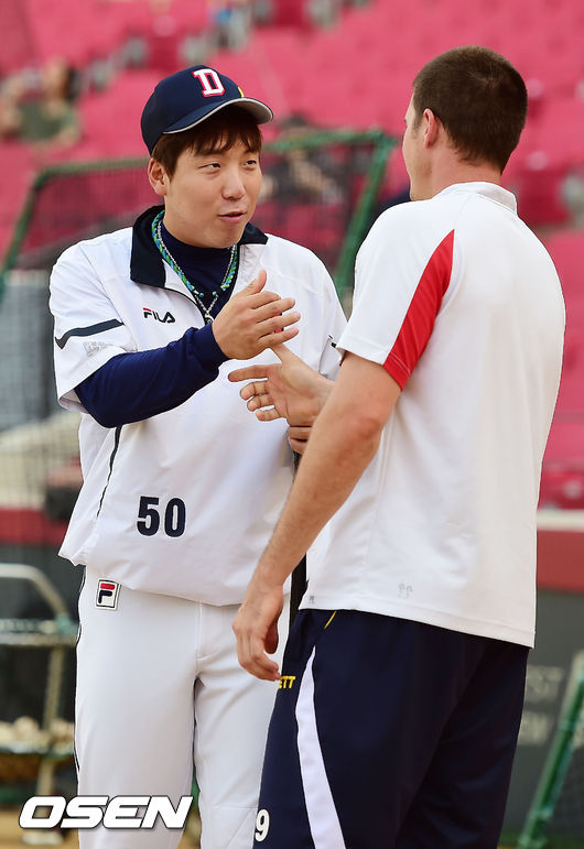 29일 오후 광주-KIA 챔피언스필드에서 2014 한국야쿠르트 세븐 프로야구 KIA와 두산의 경기가 열릴 예정인 가운데 양 팀 훈련시간에 두산 김현수가 KIA 브렛 필에게 자신의 배트를 선물로 주며 얘기를 나누고 있다.