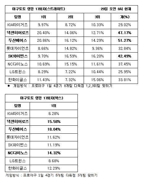 국민체육진흥공단(www.kspo.or.kr)이 발행하는 체육진흥투표권 수탁사업자인 스포츠토토 공식발매사이트인 베트맨(www.betman.co.kr)은 30일 오후 6시30분부터 벌어지는 두산-롯데, 넥센-LG, 한화-SK, KIA-NC 등 4경기 8개팀을 대상으로 한 야구토토 랭킹 17회차 스트레이트 게임 중간집계결과 두산(51.27%), 넥센(47.17%), SK(42.49%)가 다득점 상위 3개팀으로 꼽혔다고 밝혔다. 반면 LG와 KIA는 각각 25.95%와 29.02%를 득표해 가장 적은 득점을 기록할 것으로 예상했다.