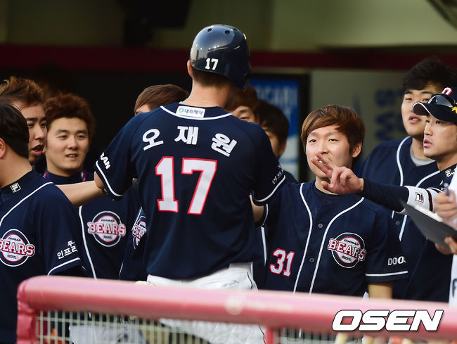 29일 오후 광주-KIA 챔피언스필드에서 열린 2014 한국야쿠르트 세븐 프로야구 KIA와 두산의 경기, 1회초 1사 주자 3루 두산 홍성흔의 중견수 오른쪽 1타점 적시타때 홈을 밟은 오재원이 선발 유희관(오른쪽)과 하이파이브를 하고 있다.