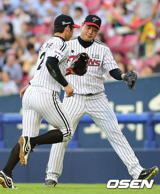 2회초 1사 만루 LG 류제국이 삼성 김상수를 유격수 땅볼로 병살을 잡아낸 뒤 오지환과 하이파이브를 하고 있다.