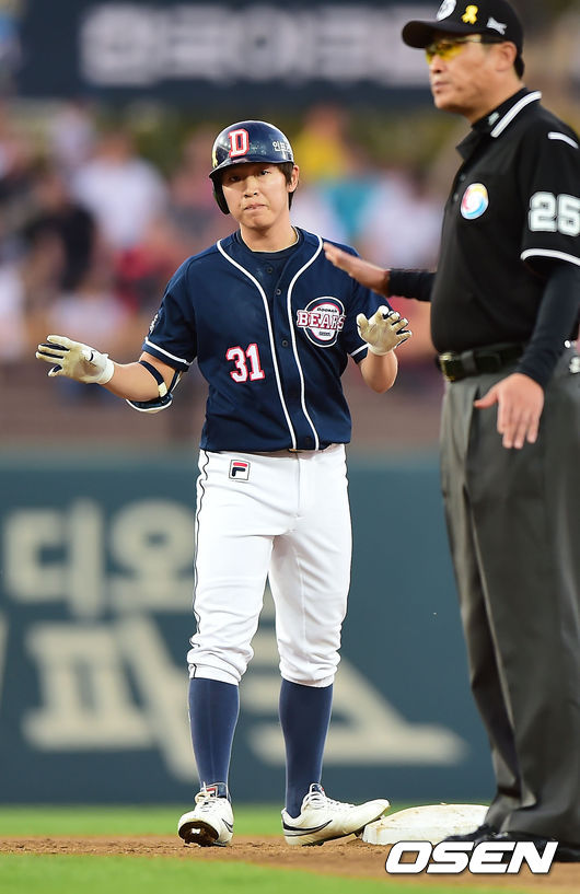 29일 오후 광주-KIA 챔피언스필드에서 열린 2014 한국야쿠르트 세븐 프로야구 KIA와 두산의 경기, 2회초 무사 주자 1,3루 두산 정수빈이 1타점 적시타를 날린 후 2루에서 사인을 보내고 있다.