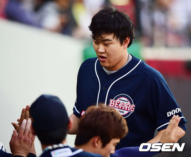 29일 오후 광주-KIA 챔피언스필드에서 열린 2014 한국야쿠르트 세븐 프로야구 KIA와 두산의 경기, 2회초 무사 주자 1,3루 두산 정수빈의 1타점 적시타때 홈을 밟은 오재일이 덕아웃에서 동료들과 하이파이브를 하고 있다.