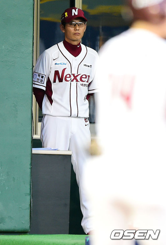 2회말 1사 1,3루 서건창 타석때 넥센 염경엽 감독이 덕아웃에서 경기를 지켜보고 있다.