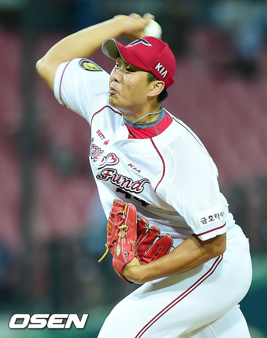 29일 오후 광주-KIA 챔피언스필드에서 열린 2014 한국야쿠르트 세븐 프로야구 KIA와 두산의 경기, 3회초 2사 주자 1,3루 KIA 선발 신창호가 강판 당한 후 마운드에 오른 박성호가 힘차게 공을 뿌리고 있다.