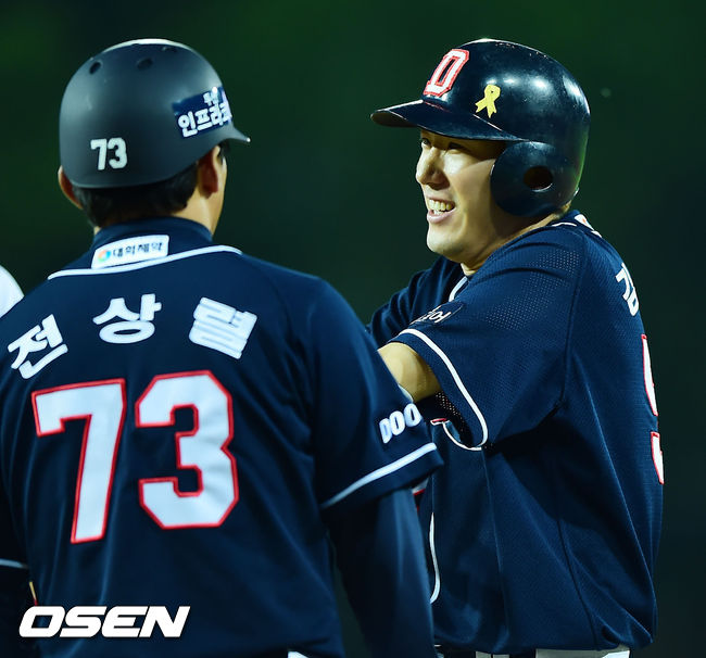 29일 오후 광주-KIA 챔피언스필드에서 열린 2014 한국야쿠르트 세븐 프로야구 KIA와 두산의 경기, 4회초 2사 주자 2,3루 두산 김재호가 좌익수 앞 2타점 적시타를 날린 후 1루에서 전상렬 코치와 하이파이브를 하고 있다.