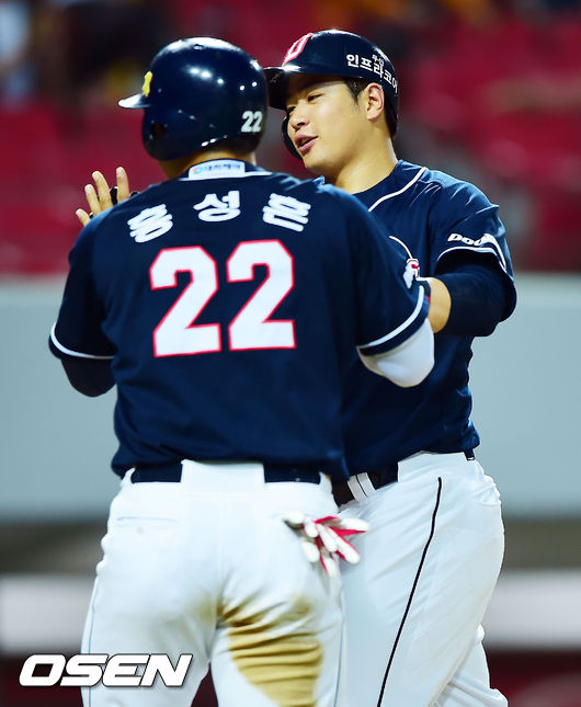 29일 오후 광주-KIA 챔피언스필드에서 열린 2014 한국야쿠르트 세븐 프로야구 KIA와 두산의 경기, 4회초 2사 주자 2,3루 두산 김재호의 좌익수 앞 2타점 적시타때 홈을 밟은 홍성흔과 김재환이 하이파이브를 하고 있다.