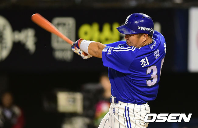 5회초 무사 1루 삼성 최형우가 우측 담장을 넘기는 투런 홈런을 때리고 있다.