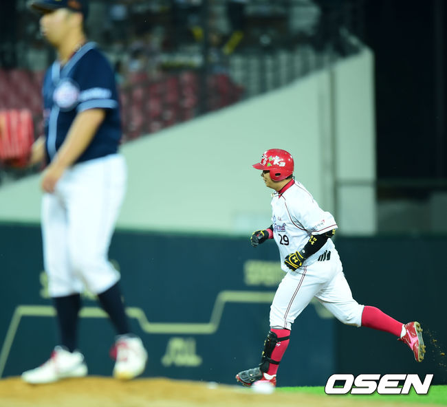 29일 오후 광주-KIA 챔피언스필드에서 열린 2014 한국야쿠르트 세븐 프로야구 KIA와 두산의 경기, 4회말 2사 주자 1루 KIA 나지완이 투런홈런을 날린 후 그라운드를 돌고 있다.