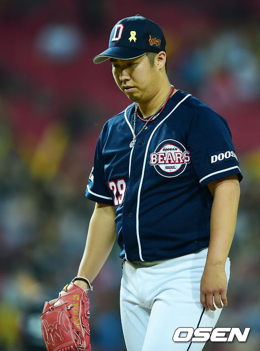 29일 오후 광주-KIA 챔피언스필드에서 열린 2014 한국야쿠르트 세븐 프로야구 KIA와 두산의 경기, 4회말을 마친 두산 유희관이 고개를 떨군채 덕아웃으로 향하고 있다.