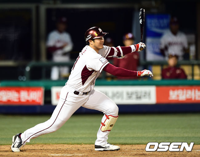 4회말 1사 2,3루 유한준이 1타점 적시타를 날리고 있다.