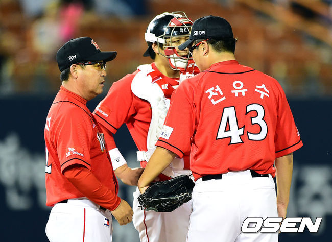 4회말 1사 1,2루 넥센 유한준 타석 때 이만수 감독이 마운드에 올라와 투수 전유수를 윤길현으로 교체하고 있다.