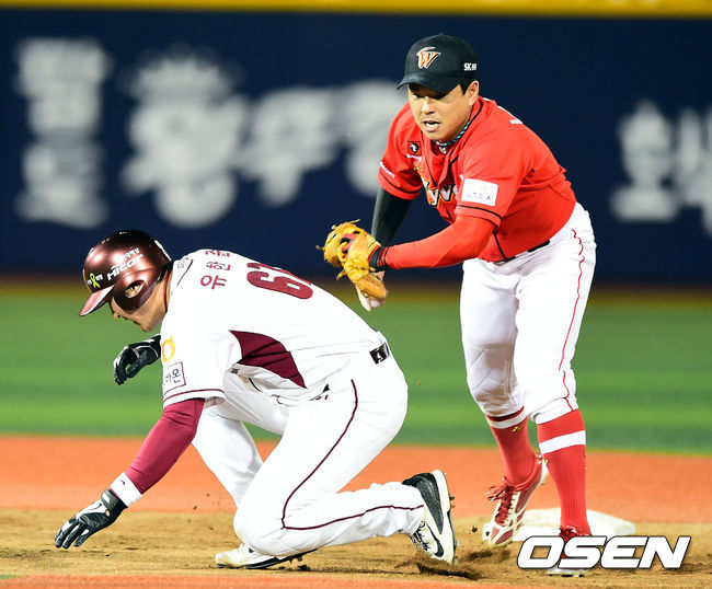 4회말 2사 1,3루 상황에서 1루주자 유한준이 도루를 시도하다 SK 2루수 나주환에게 태그 아웃 되고 있다.