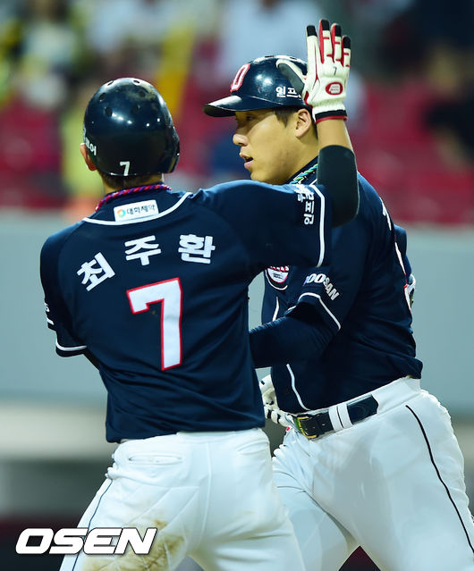 29일 오후 광주-KIA 챔피언스필드에서 열린 2014 한국야쿠르트 세븐 프로야구 KIA와 두산의 경기, 7회초 무사 1루 두산 김현수가 우월 투런 홈런을 날린 후 홈에서 최주환과 기쁨을 나누고 있다.