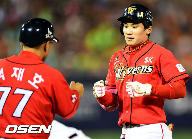 6회초 1사 3루 1타점 적시타를 날린 박계현이 1루에서 백재호 코치와 기뻐하고 있다.