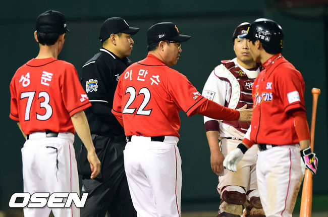 6회초 1사 1, 2루 타석 조동화가 김귀한 구심의 볼판정에 불만을 품자 이만수 감독이 나와 말리고 있다.