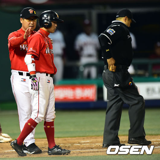 6회초 1사 1, 2루 타석 조동화가 김귀한 구심의 볼판정에 불만을 품자 이만수 감독이 나와 조동화를 달래고 있다.