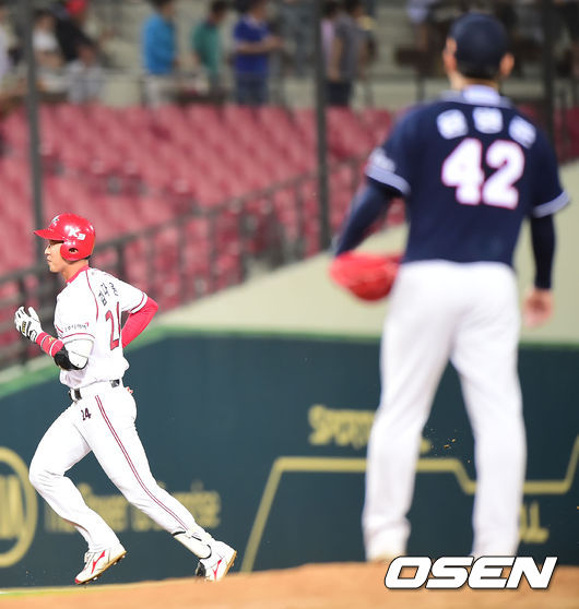 29일 오후 광주-KIA 챔피언스필드에서 열린 2014 한국야쿠르트 세븐 프로야구 KIA와 두산의 경기, 7회말 1사 주자 1루 KIA 김다원이 좌월 투런 홈런을 날린 후 그라운드를 돌고 있다.