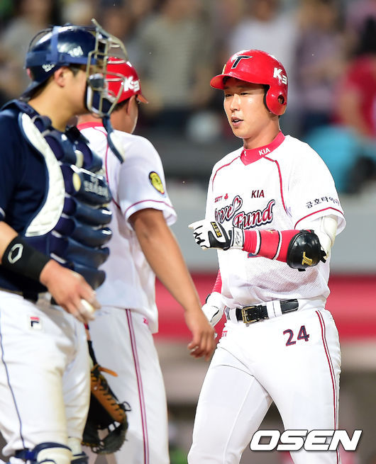29일 오후 광주-KIA 챔피언스필드에서 열린 2014 한국야쿠르트 세븐 프로야구 KIA와 두산의 경기, 7회말 1사 주자 1루 KIA 김다원이 좌월 투런 홈런을 날린 후 홈에서 김창회 코치와 하이파이브를 하고 있다.