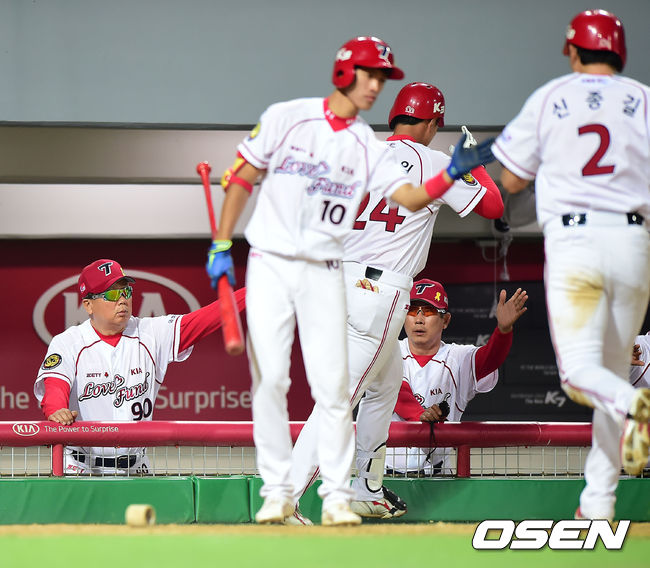 29일 오후 광주-KIA 챔피언스필드에서 열린 2014 한국야쿠르트 세븐 프로야구 KIA와 두산의 경기, 7회말 1사 주자 1루 KIA 김다원이 좌월 투런 홈런을 날린 후 덕아웃에서 선동렬 감독과 하이파이브를 하고 있다.