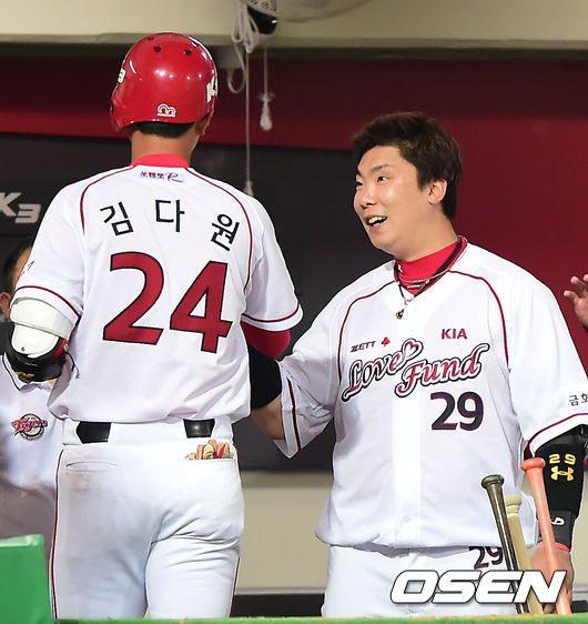 29일 오후 광주-KIA 챔피언스필드에서 열린 2014 한국야쿠르트 세븐 프로야구 KIA와 두산의 경기, 7회말 1사 주자 1루 KIA 김다원이 좌월 투런 홈런을 날린 후 덕아웃에서 오늘 4회에 투런포를 날린 나지완과 하이파이브를 하고 있다.