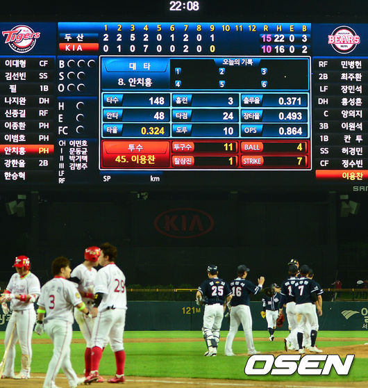 29일 광주 챔피언스필드에서는 두산과 KIA가 난타전을 벌였다. 통산 5번째 양팀 선발타자 전원안타 진기록까지 나왔다. 양팀 스코어는 15-10. 양팀의 안타는 두산 22개, KIA 16개 등 모두 38개가 쏟아져 나왔다. 투수들을 고개를 숙였고 타자들은 펄펄 날았다.