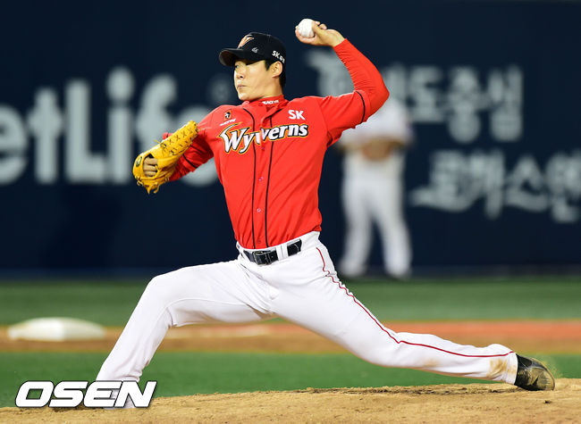 8회말 2사 2루 SK 박희수가 힘차게 공을 뿌리고 있다.