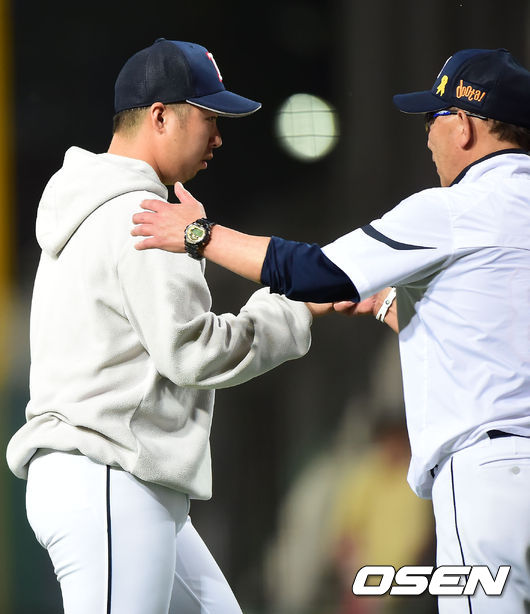 경기를 마치고 승리투수가 된 두산 유희관이 송일수 감독에게 격려를 받고 있다. / rumi@osen.co.kr