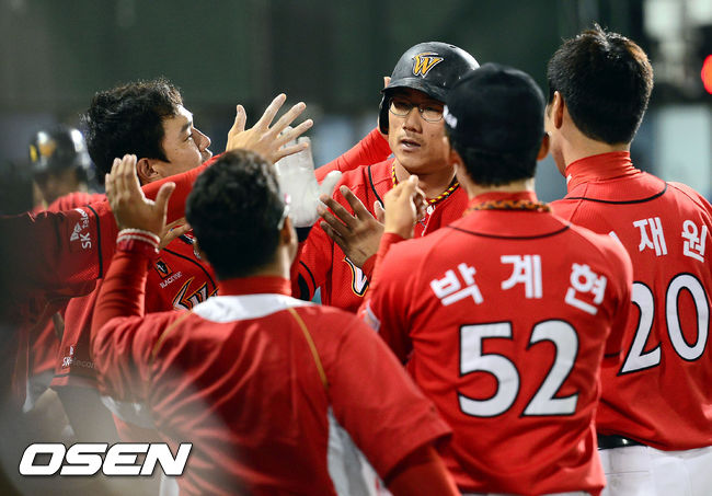 9회초 2사 만루 우월 만루포를 날린 SK 대타 박정권이 덕아웃에서 동료들과 하이파이브를 나누고 있다.